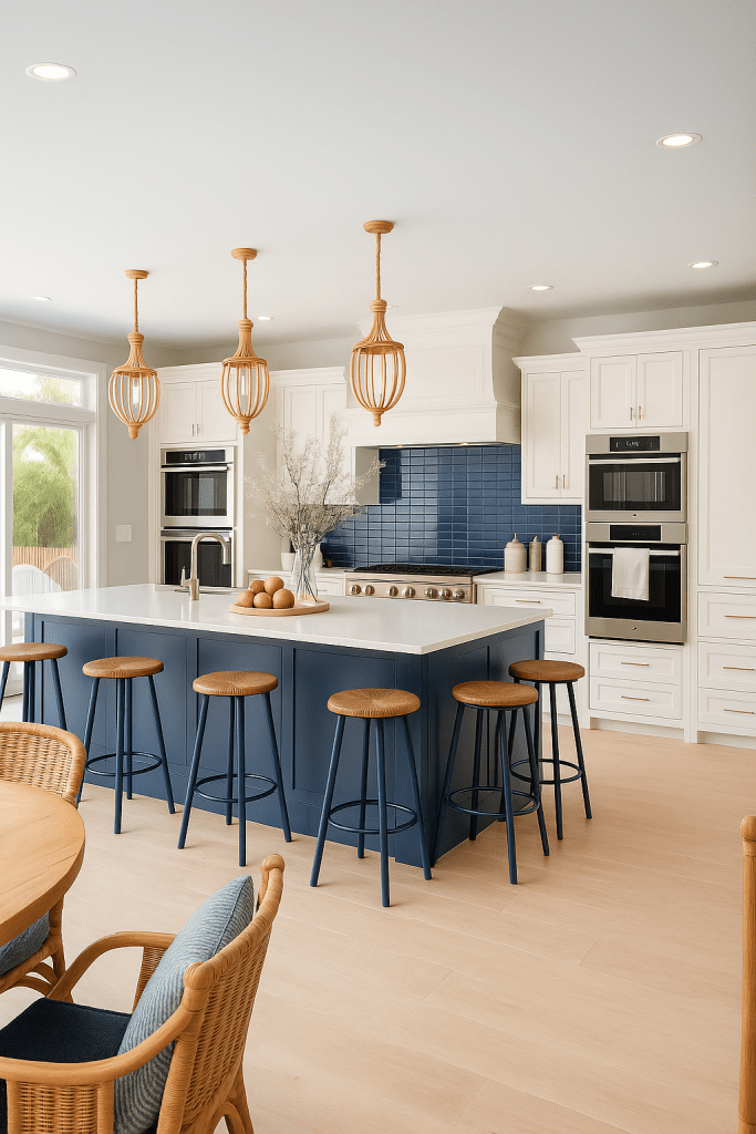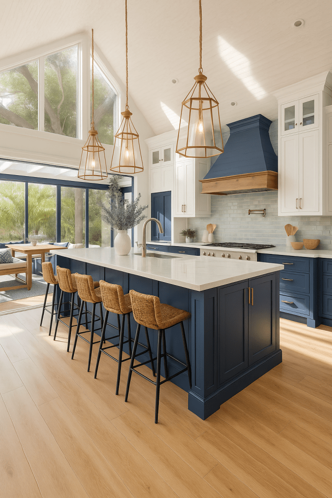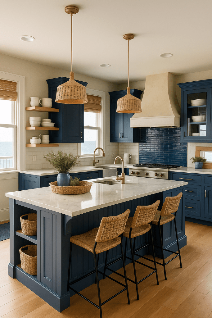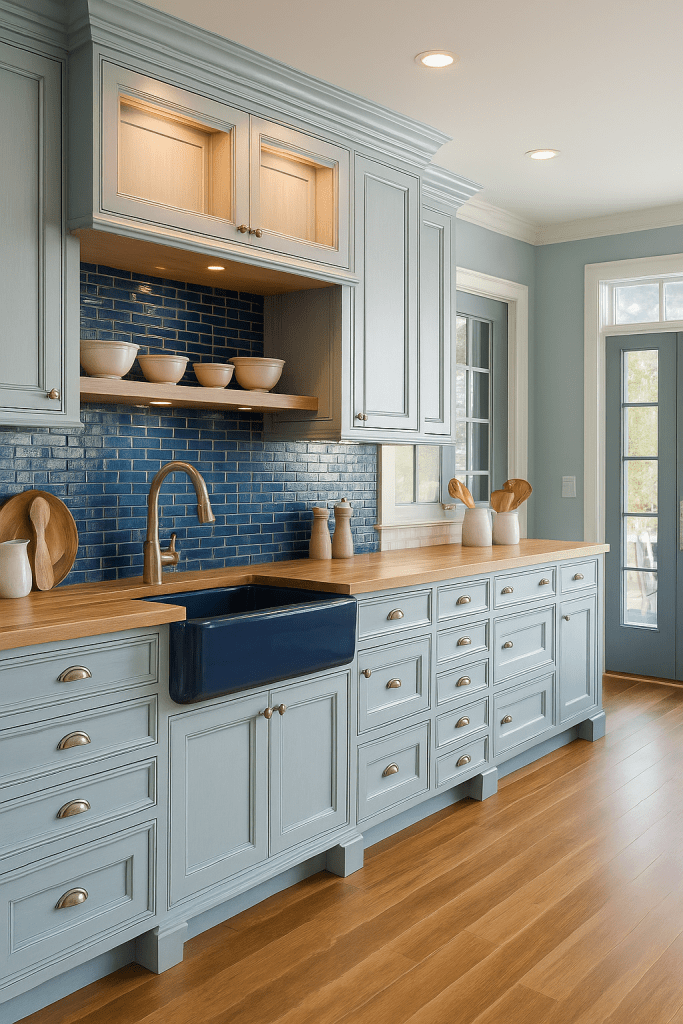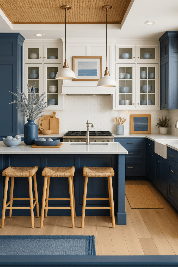 From soft sky blue cabinetry to bold navy islands, these kitchens show how you can adapt the style to fit your space — whether you prefer modern coastal, rustic charm, or a refined classic look.