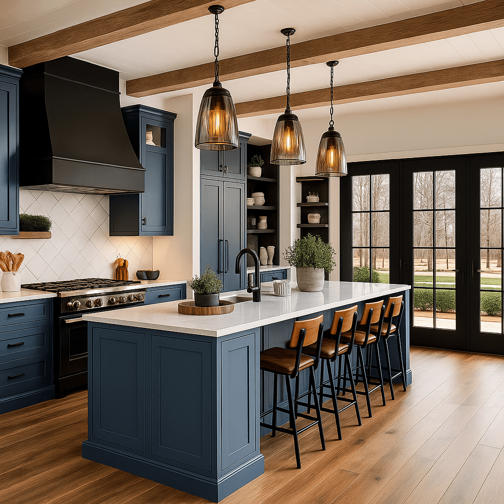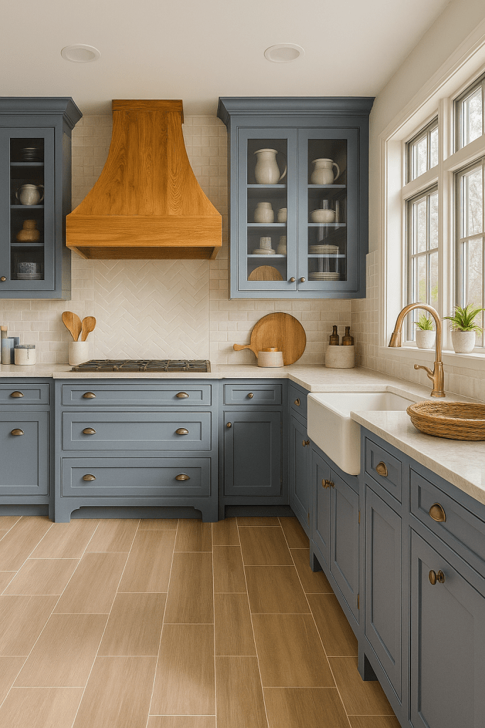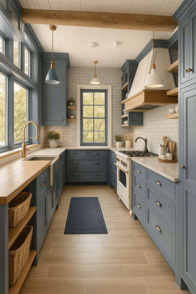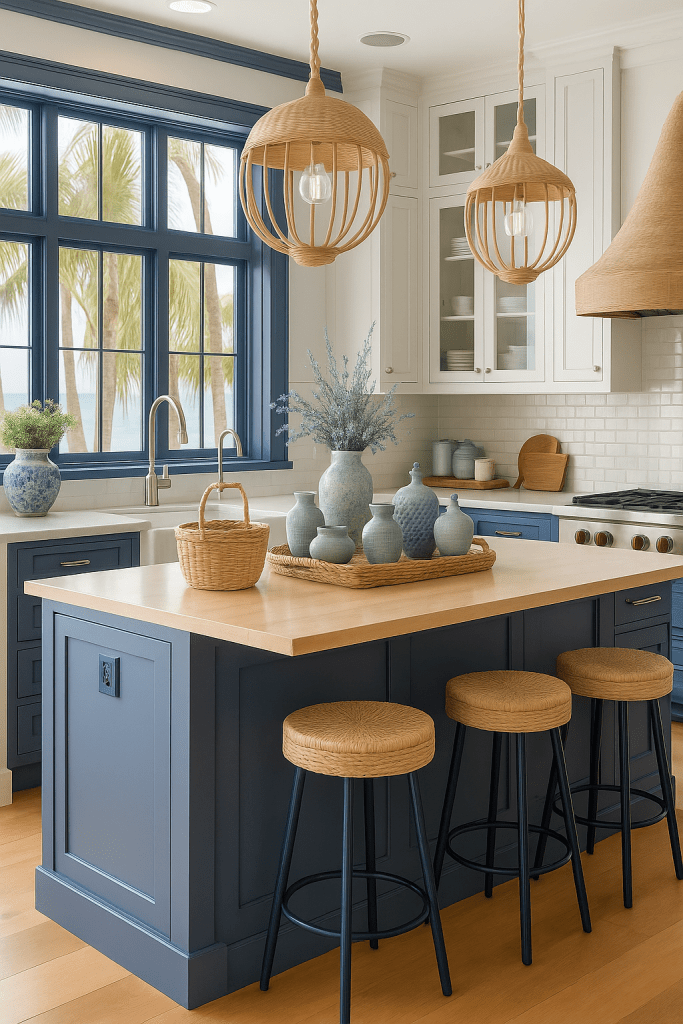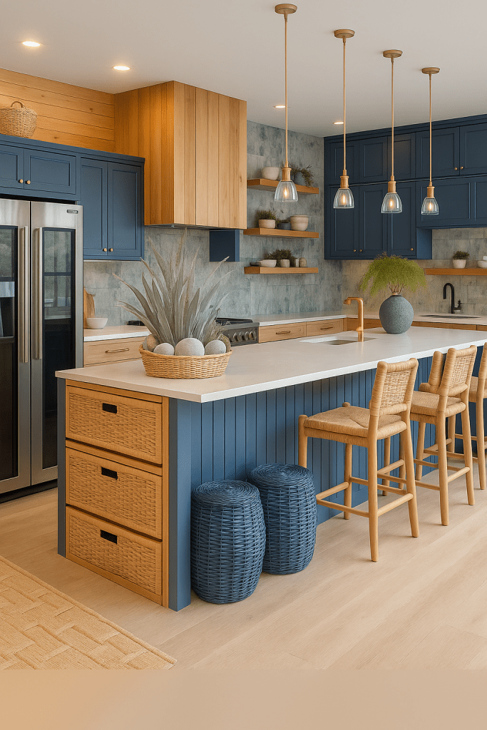 From soft sky blue cabinetry to bold navy islands, these kitchens show how you can adapt the style to fit your space — whether you prefer modern coastal, rustic charm, or a refined classic look.