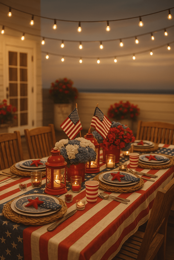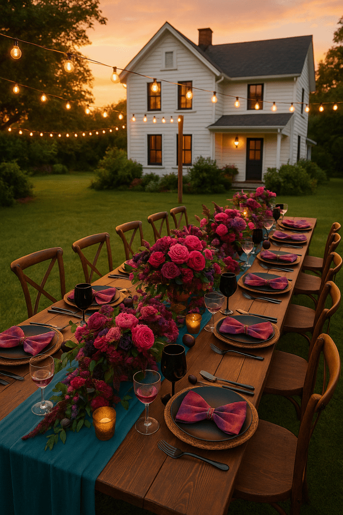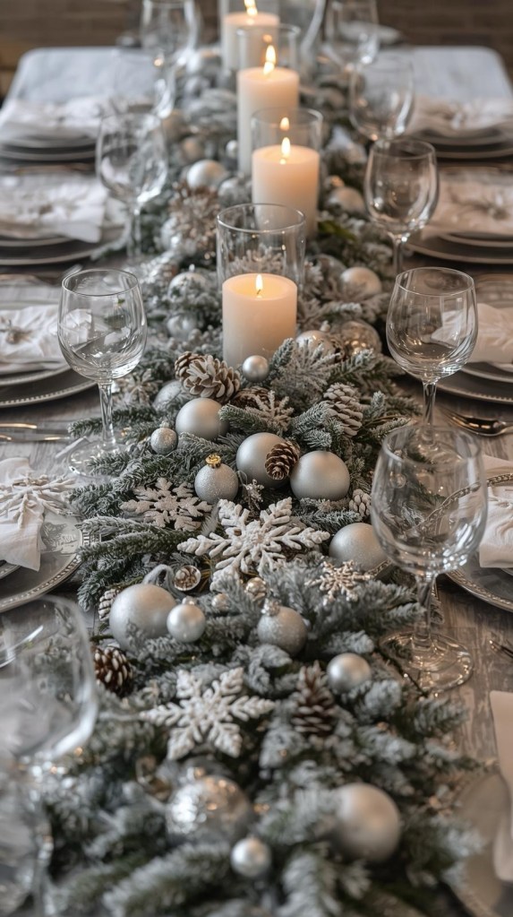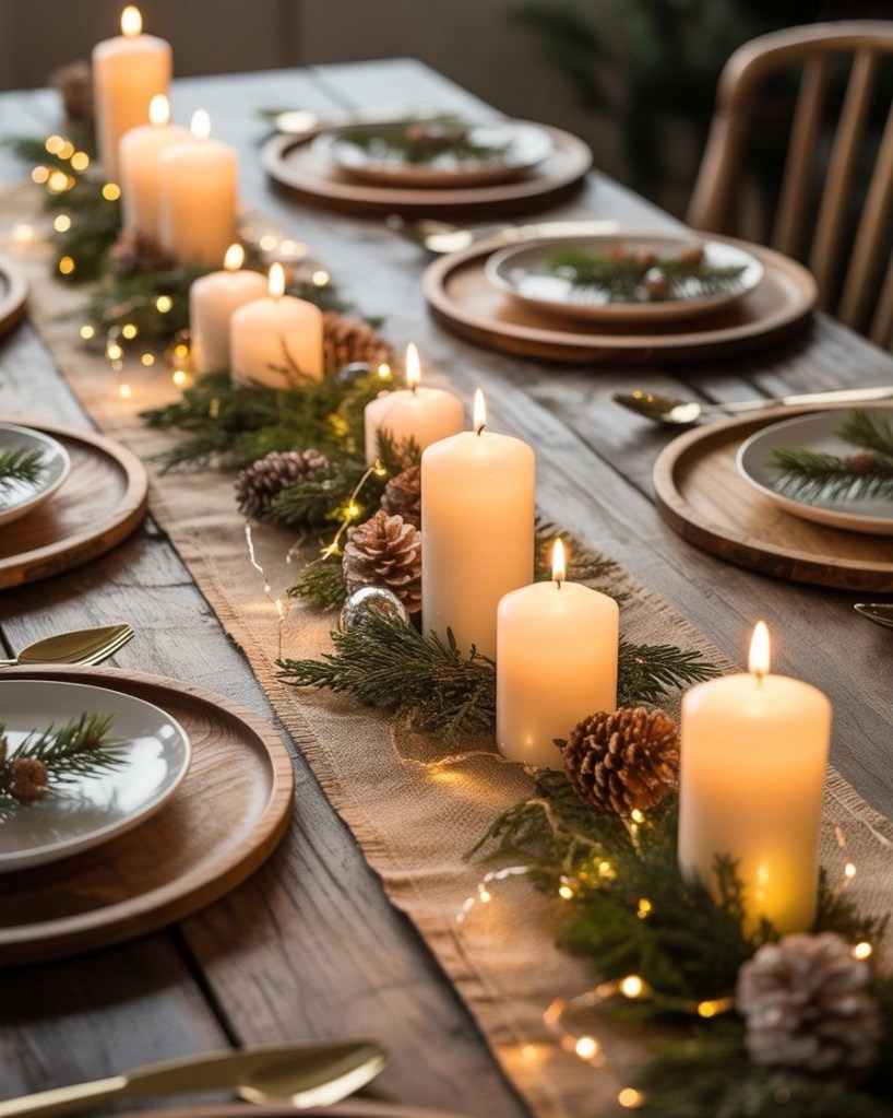 This decor style works beautifully for winter hosting. A long table with candles, greenery, and simple dinnerware instantly feels festive and cozy. Even outdoor spaces can be styled with throws, lanterns, and soft lighting for a magical winter setting.