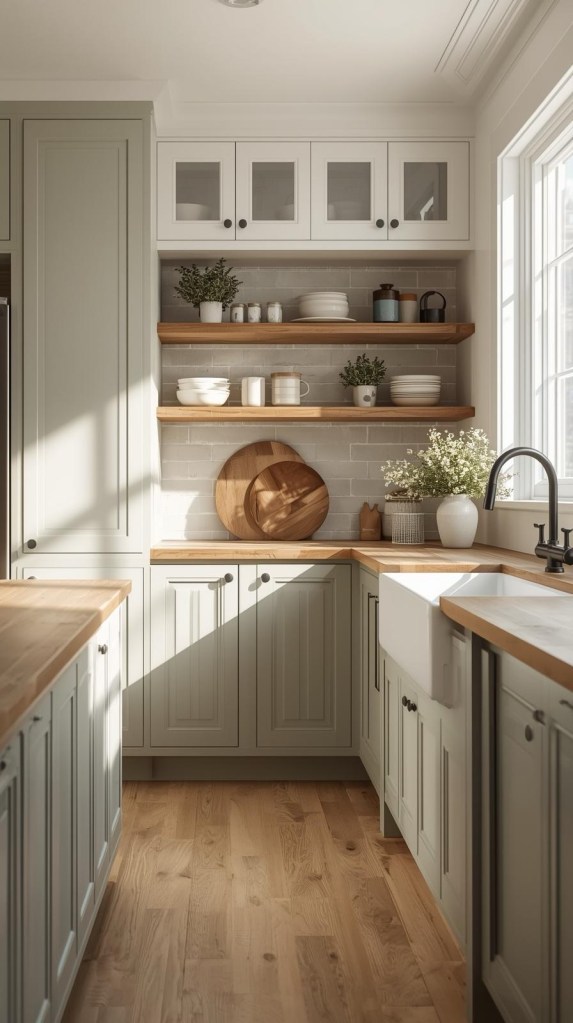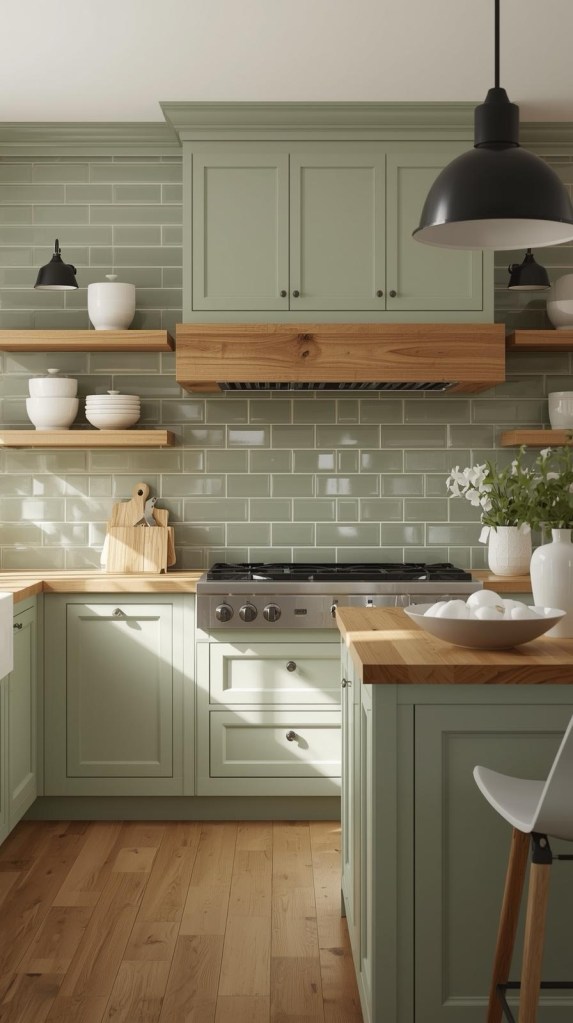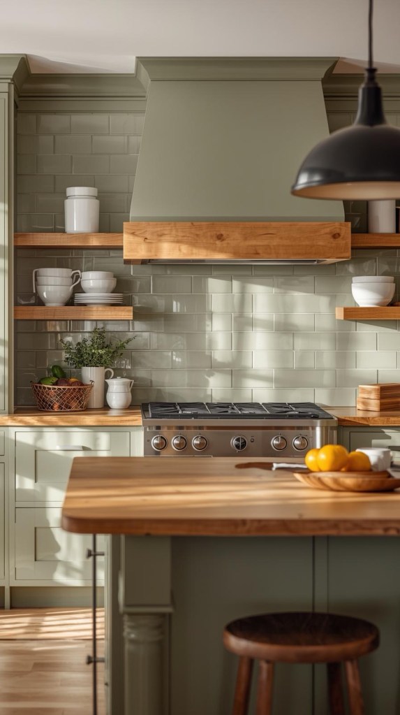 One of the most beautiful ways to style a sage green kitchen is by pairing it with warm wood tones.